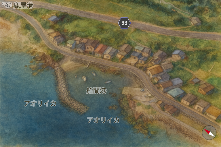 船間港は鹿屋港の南に位置する小規模な漁港で、外向きの護岸と岩礁帯がそのまま釣り場になるポイントだ。規模は小さいものの、外海側の潮が届く位置にあるため、条件が揃うとアオリイカが差してくることがある。潮位や風向き、回遊のタイミングが結果に直結するタイプのフィールドである。とくに、潮が動き始める瞬間や夕まずめの時間帯は、イカが外側の地形変化に沿って回る“通過のタイミング”が現れやすい。