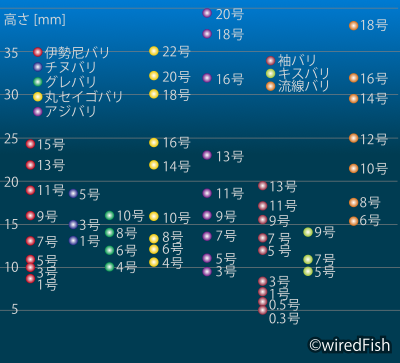 針の形状やサイズを示す寸法として、チモトから針の曲がり部先端までは高さ、針先から軸、または、針の曲がり部先端まではフトコロと呼ばれています。