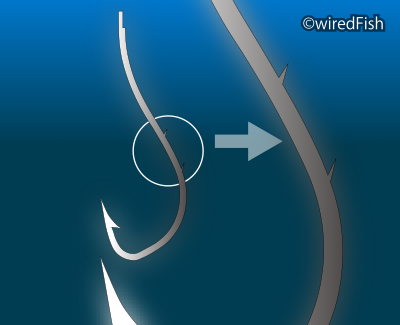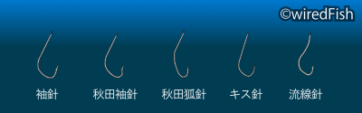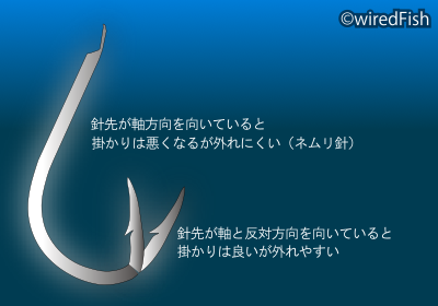 ネムリ針とは逆に、秋田袖針のように積極的に針先を軸方向とは反対方向に向けて掛かりを良くした針もあります。
