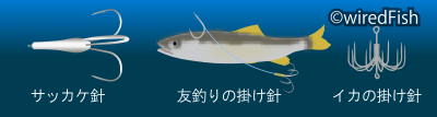 掛け針には、アユの友釣りやコロガシ釣りで用いる掛け針、ボラ釣りで用いられるサッカケ針、イカ釣りで用いられる掛け針などがあります。