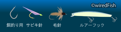 喰わせ針には、毛針、サビキ針なども含まれます。ルアーフックも餌に見立てたルアーに付けた針を食わせることとなりますので喰わせ針に分類できます。