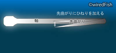 針の先曲がりにひねりを加えて軸平面を故意に歪ませた針もあります。このような針はヒネリ針といいます。ヒネリ針は、主にフッキング率向上を期待して用いられます。