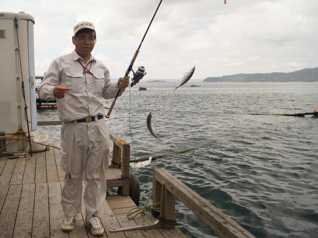 5番イカダの釣り人の釣果。ジグでネイゴが好調!! 良型カワハギも釣れている |
