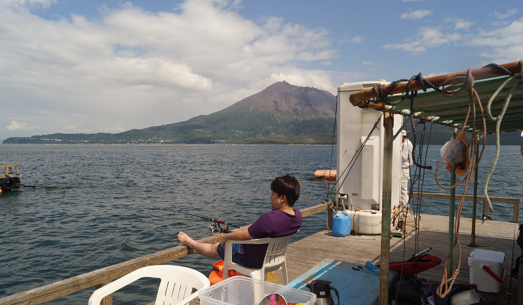 海潟イカダ1番。雨の中、屋根の下から長竿で狙う。こんな釣り方もOK! |